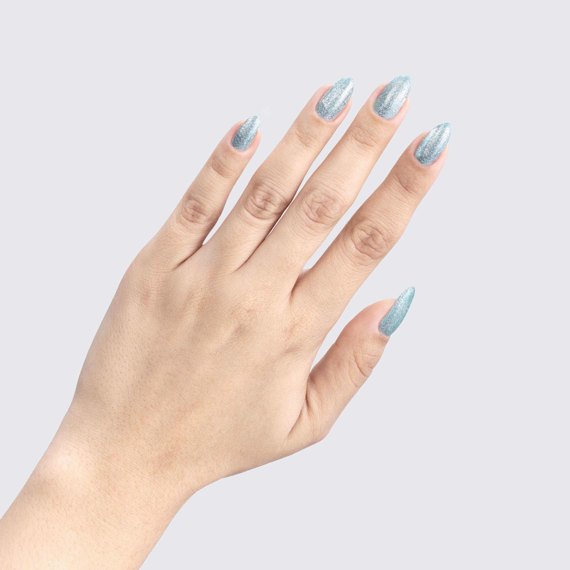 Silver with pale blue tint. Metallic foil sparkle. Opaque. Cool undertone.